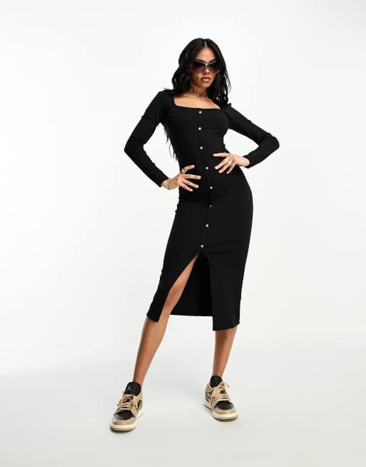 Mango button front ribbed midi dress in black