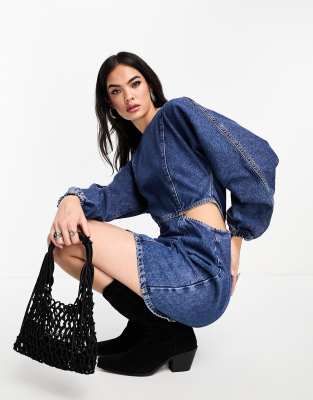 Mango cut out side puff sleeve mini dress in blue denim