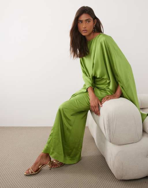 Mango drape detail satin half sleeve maxi dress in green