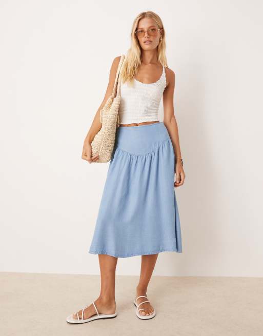 Mango drop waist gathered detail midi skirt in sky blue