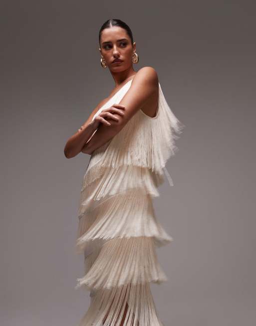 Mango fringe one shoulder maxi dress in white