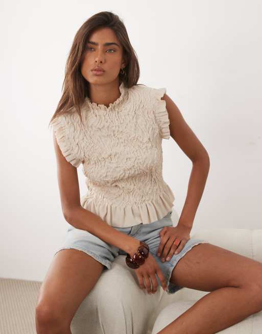 Mango high neck frill sleeveless top in beige