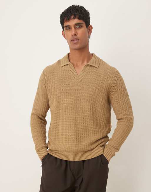 Mango knitted open collar polo shirt in beige