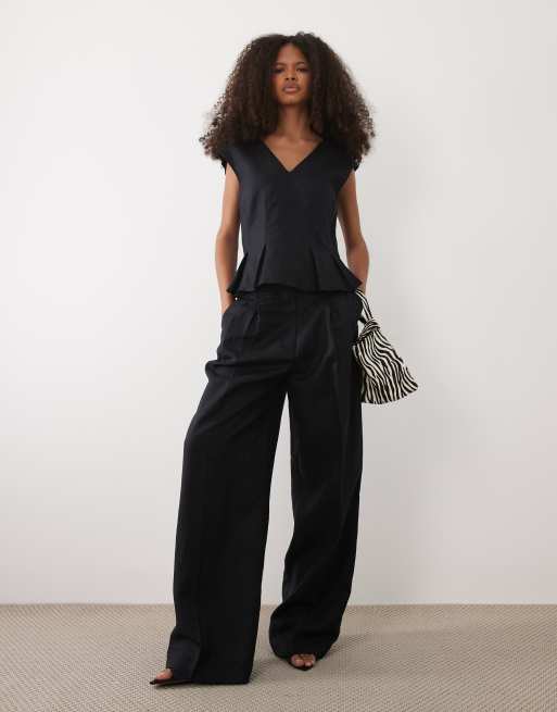 Mango Lbolga linen mix v neck sleeveless peplum hem top & trouser co-ord in navy