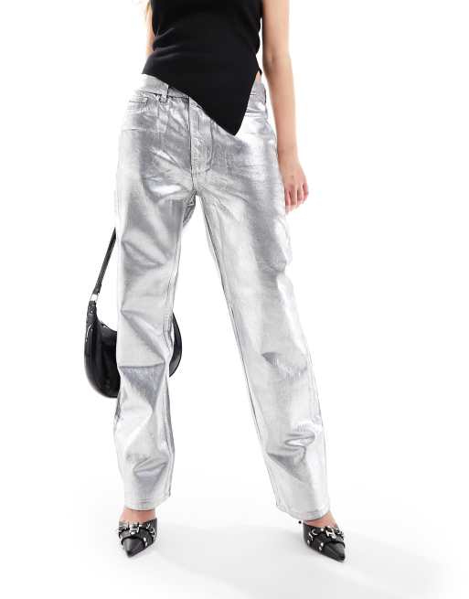 Mango metallic straight leg jeans in silver