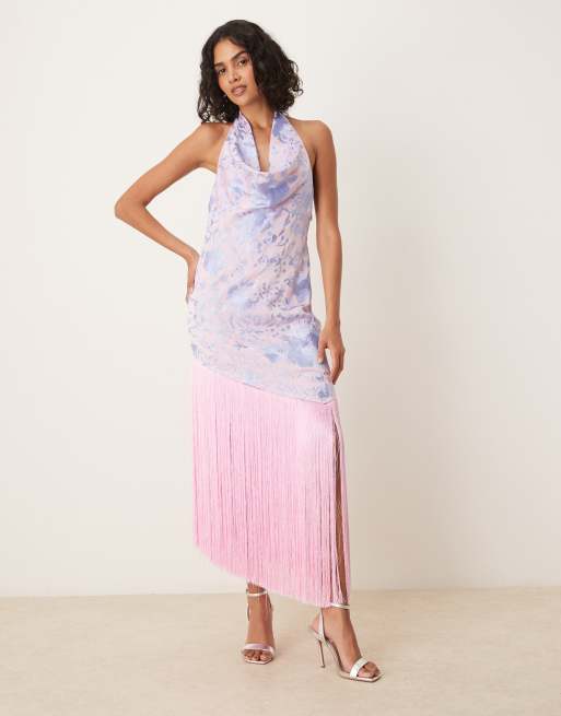 Mango premium halterneck embroidered floral maxi dress with fringing in pink