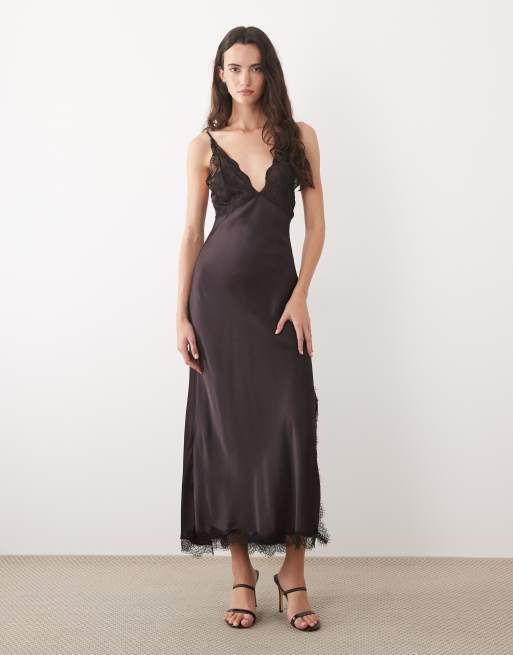 Mango satin maxi dress with delicate lace trim in deep red