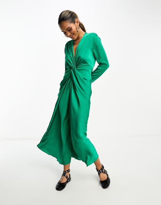 Mango satin wrap detail front dress in green