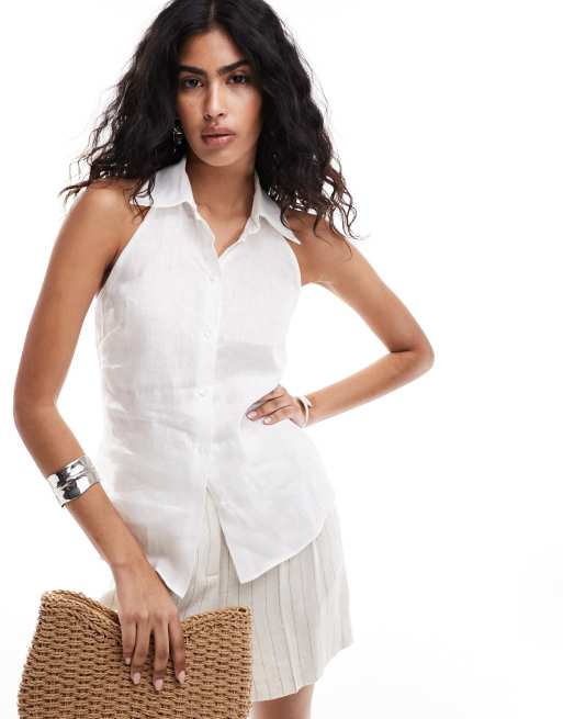 Mango Selection linen halter shirt in white