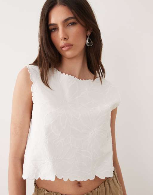 Mango sleeveless boat neck top with floral embroidery in white