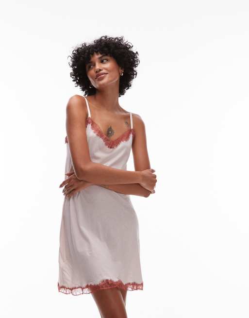 Mango soft touch modal cami slip dress with contrast lace trim in pink