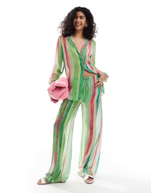 Mango stripe beach shirt and trousers co-ord set in green and pink
