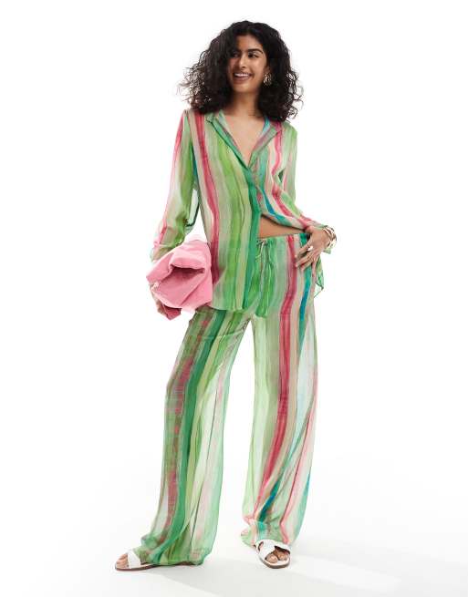 Mango stripe co-ord beach trousers in green and pink