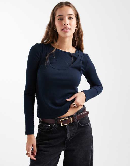 Mango Teen 2 in 1 long sleeve top in navy