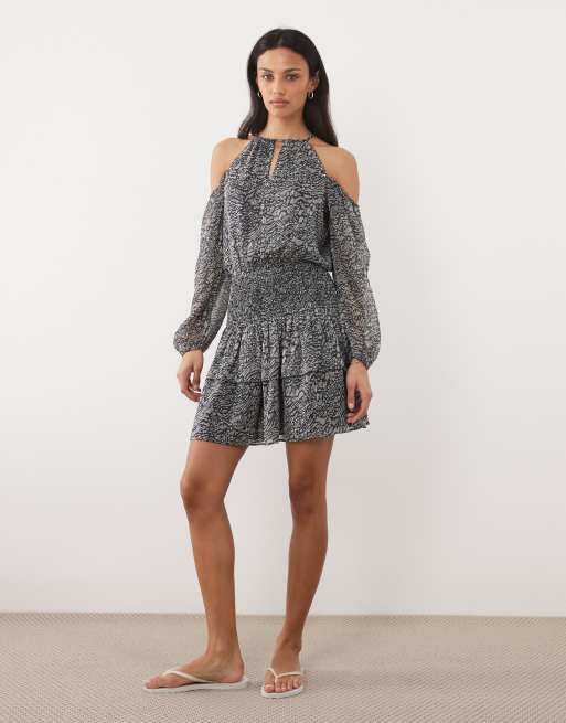 Mango Teen cold shoulder ruffle mini dress in navy floral print