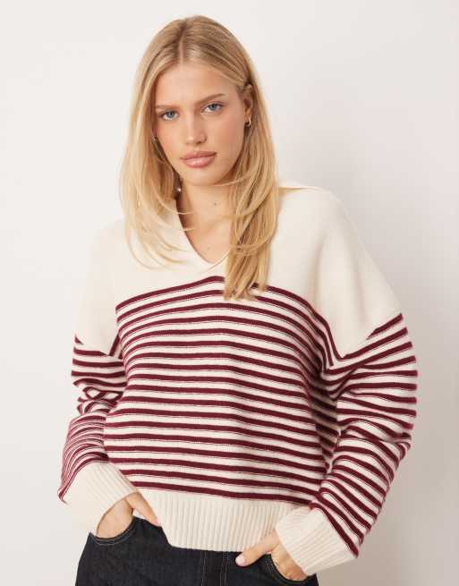 Mango v neck knitted polo top in burgundy stripe