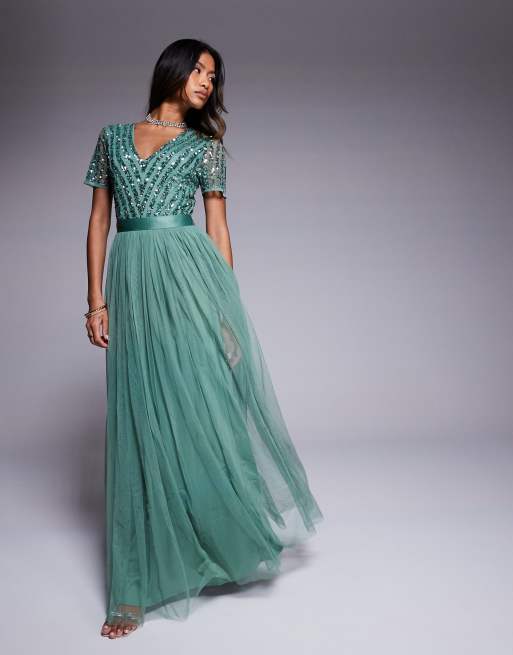 Maya Belted stripe embellished bridesmaid maxi dress in dark sage