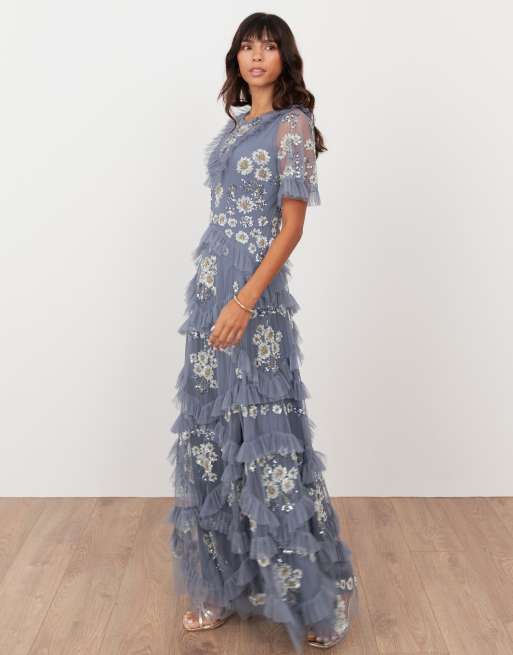 Maya Embellished angel sleeve ruffle maxi dress in infinity blue