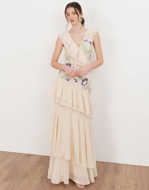 Maya Embellished asymmetric ruffle maxi dress in vanilla