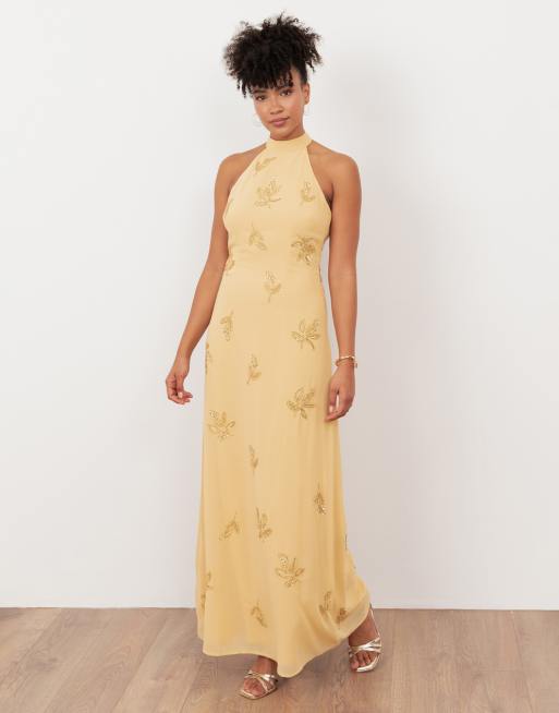 Maya Embellished halter neck open back maxi dress in buttercream