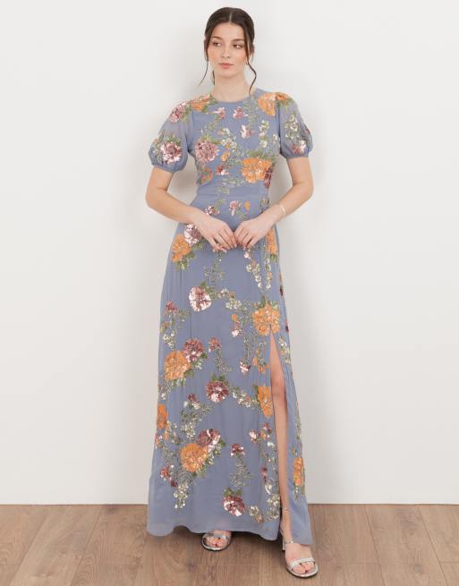 Maya Embellished puff sleeve open back maxi dress in wisteria blue