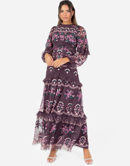 Maya Embroidered long sleeve maxi dress in berry