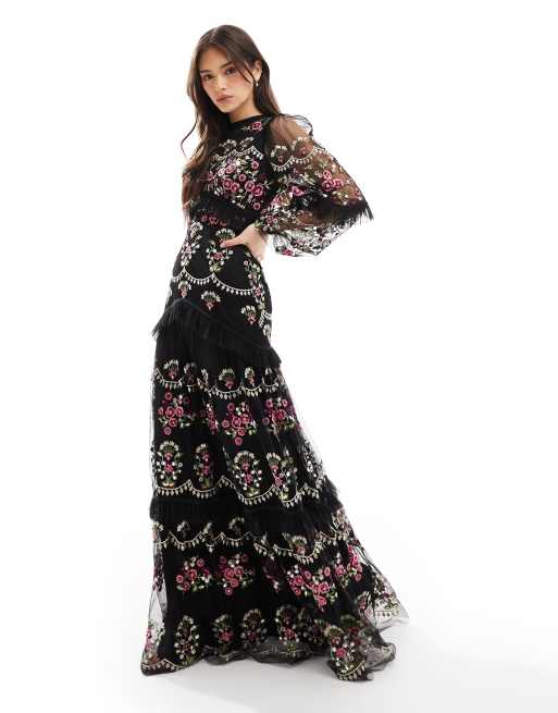 Maya Embroidered long sleeve maxi dress in black