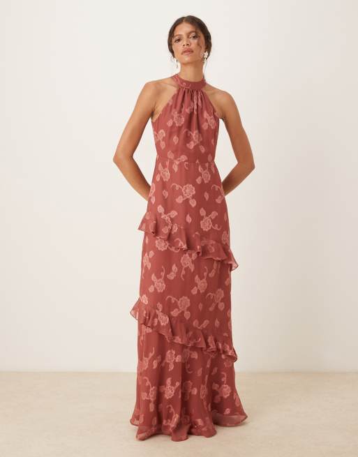 Maya Floral jacquard halter neck maxi dress in copper rose