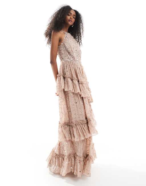 Maya Fully embellished halter neck maxi dress in beige