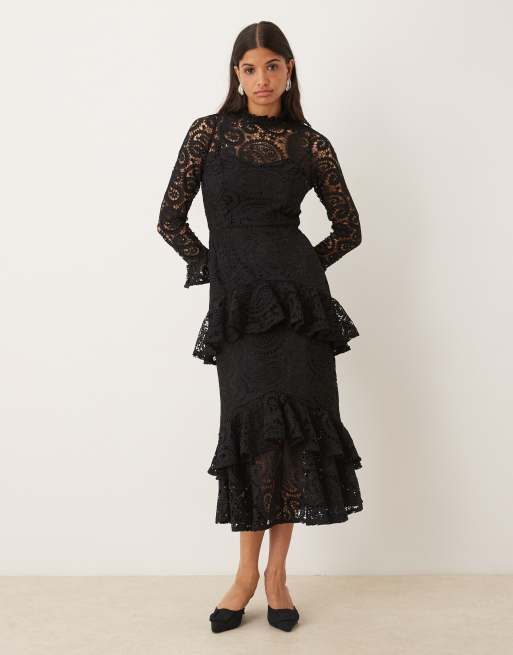 Maya High neck long sleeve lace midaxi dress in black