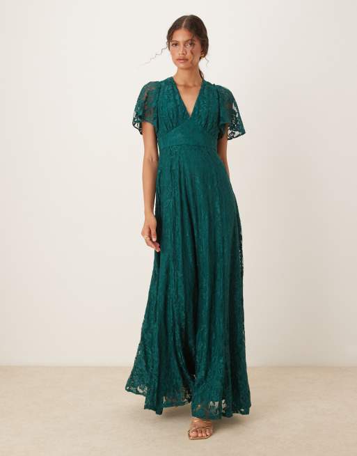 Maya Lace v neck angel sleeve maxi dress in emerald green