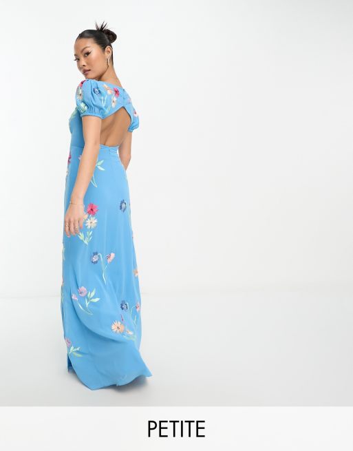 Maya Petite puff sleeve embroidered maxi dress in blue