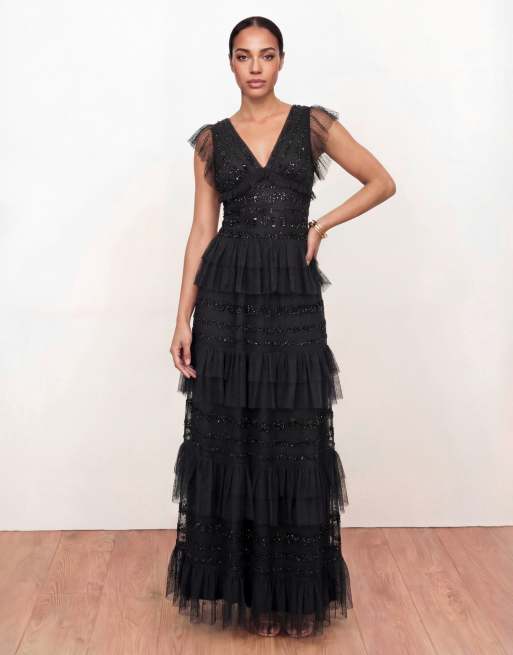 Maya Spot mesh embellished flutter sleeve tiered maxi dress in black