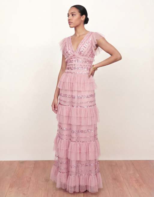Maya Spot mesh embellished flutter sleeve tiered maxi dress in soft pink