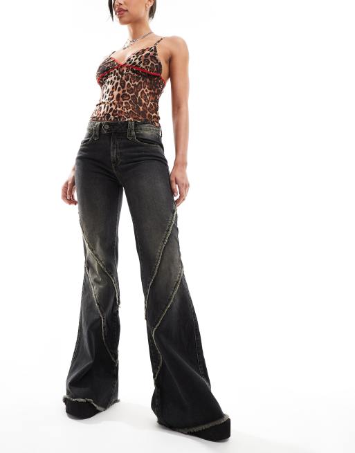 Minga London distressed flare jeans in washed black overdye