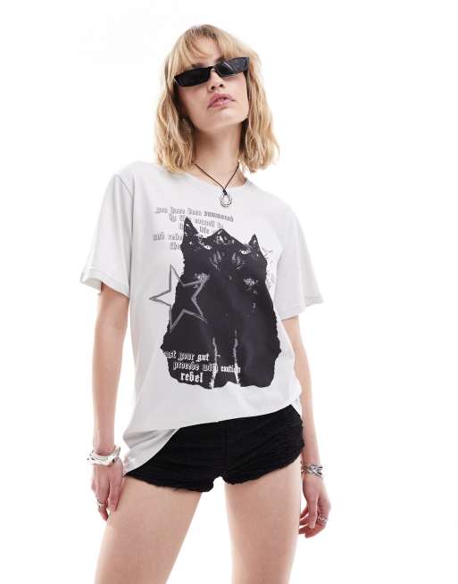Minga London oversized t-shirt with black cat graphics in off white
