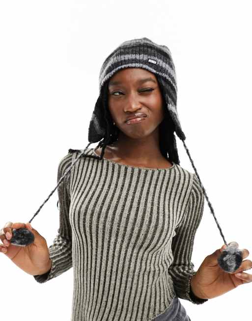 Minga London stripe knitted beanie with ear covers and bobbles in multi