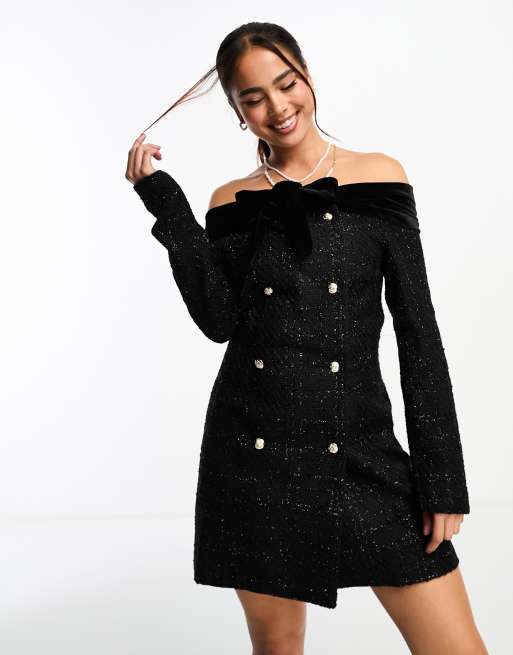 Miss Selfridge bardot boucle mini dress with velvet trim in black