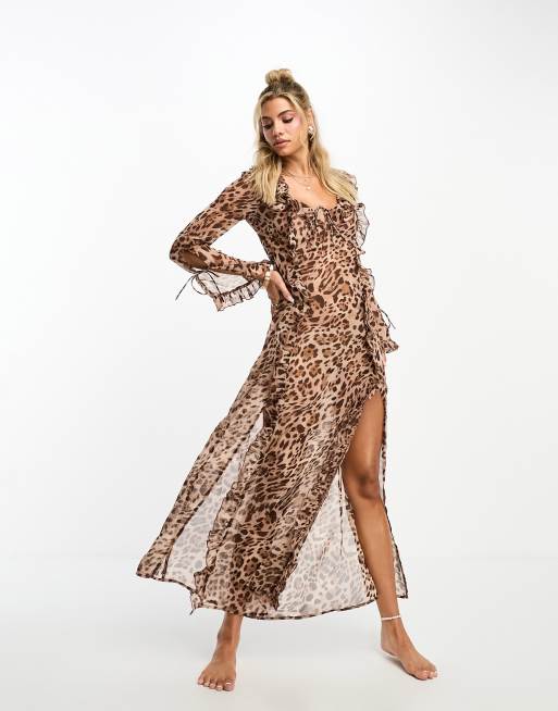 Miss Selfridge beach chiffon leopard long sleeve side split maxi dress
