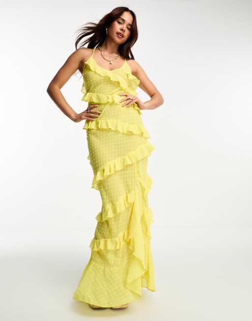 Miss Selfridge beach doby chiffon bias ruffle side split maxi dress in yellow