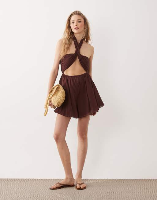 Miss Selfridge beach tie front cheesecloth playsuit in chocolate