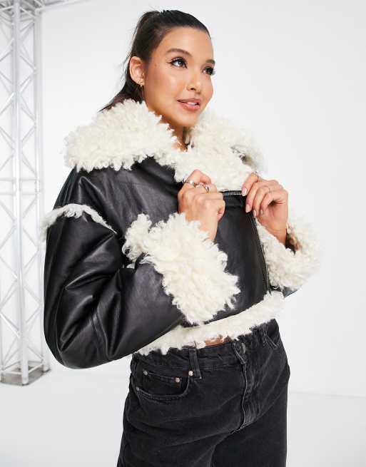 Miss Selfridge crop borg aviator jacket in black co-ord