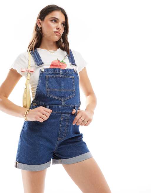 Miss Selfridge dungaree denim shorts in mid blue wash