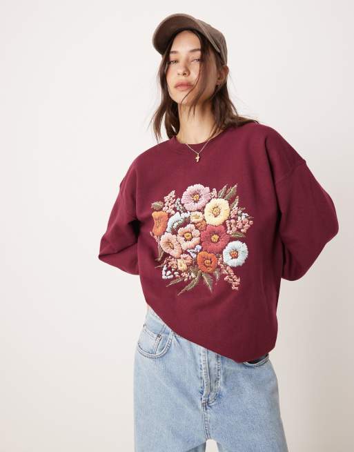 Miss Selfridge floral print oversized sweatshirt in burgundy