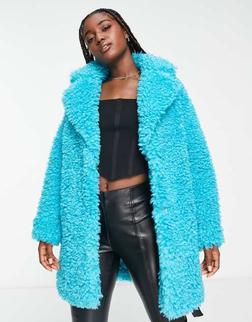 Miss Selfridge fluffy borg faux leather wrap coat in bright blue