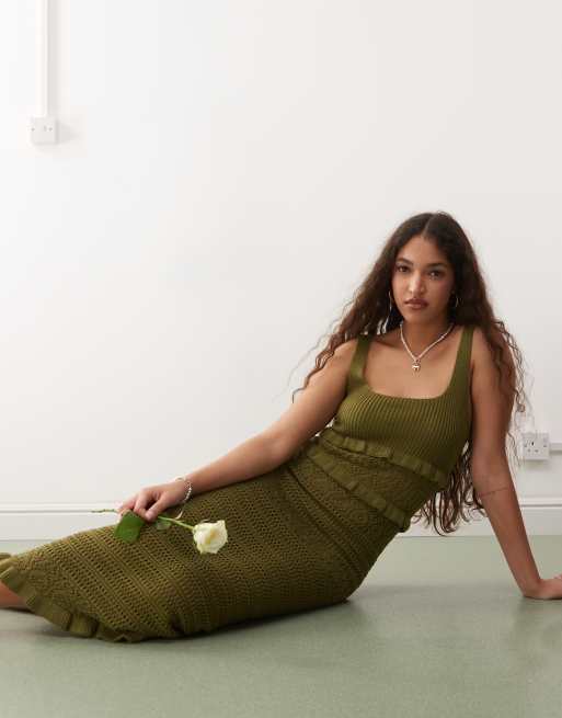 Miss Selfridge frill crochet maxi dress in khaki