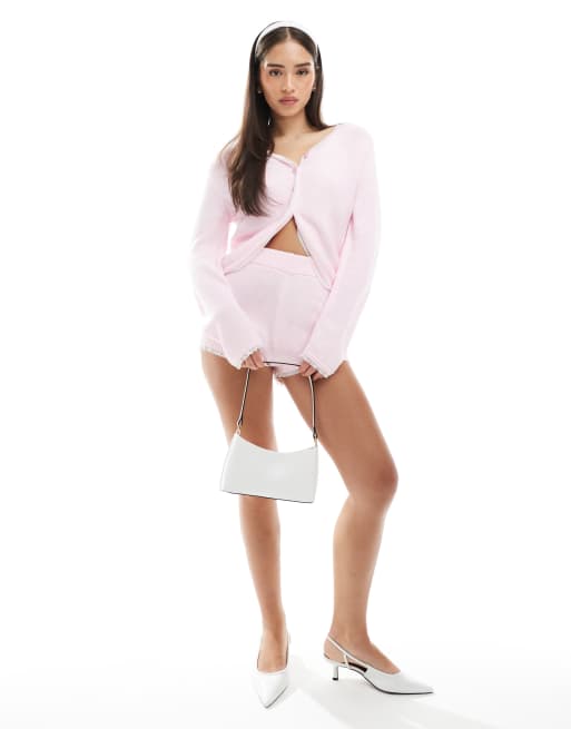 Miss Selfridge knitted lace trim booty short co ord in pink