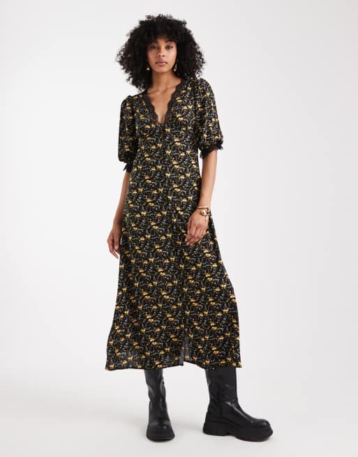Miss Selfridge lace trim button through maxi dress in black ditsy