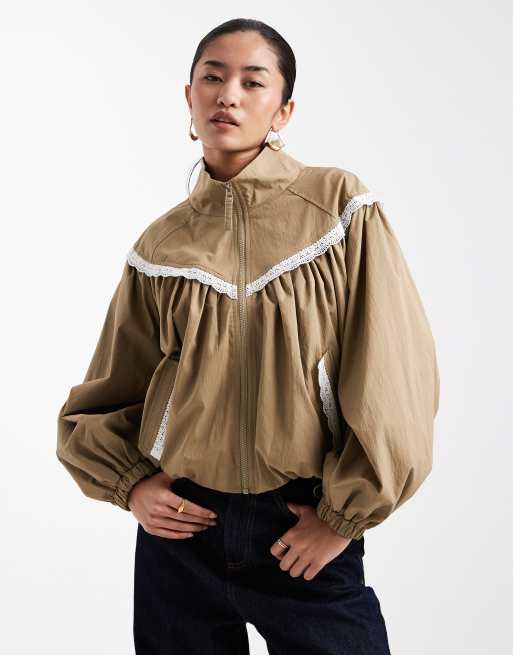 Miss Selfridge lace trim overszied bomber jacket in khaki