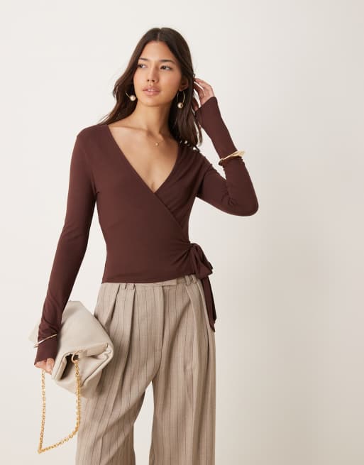 Miss Selfridge long sleeve jersey wrap top in chocolate